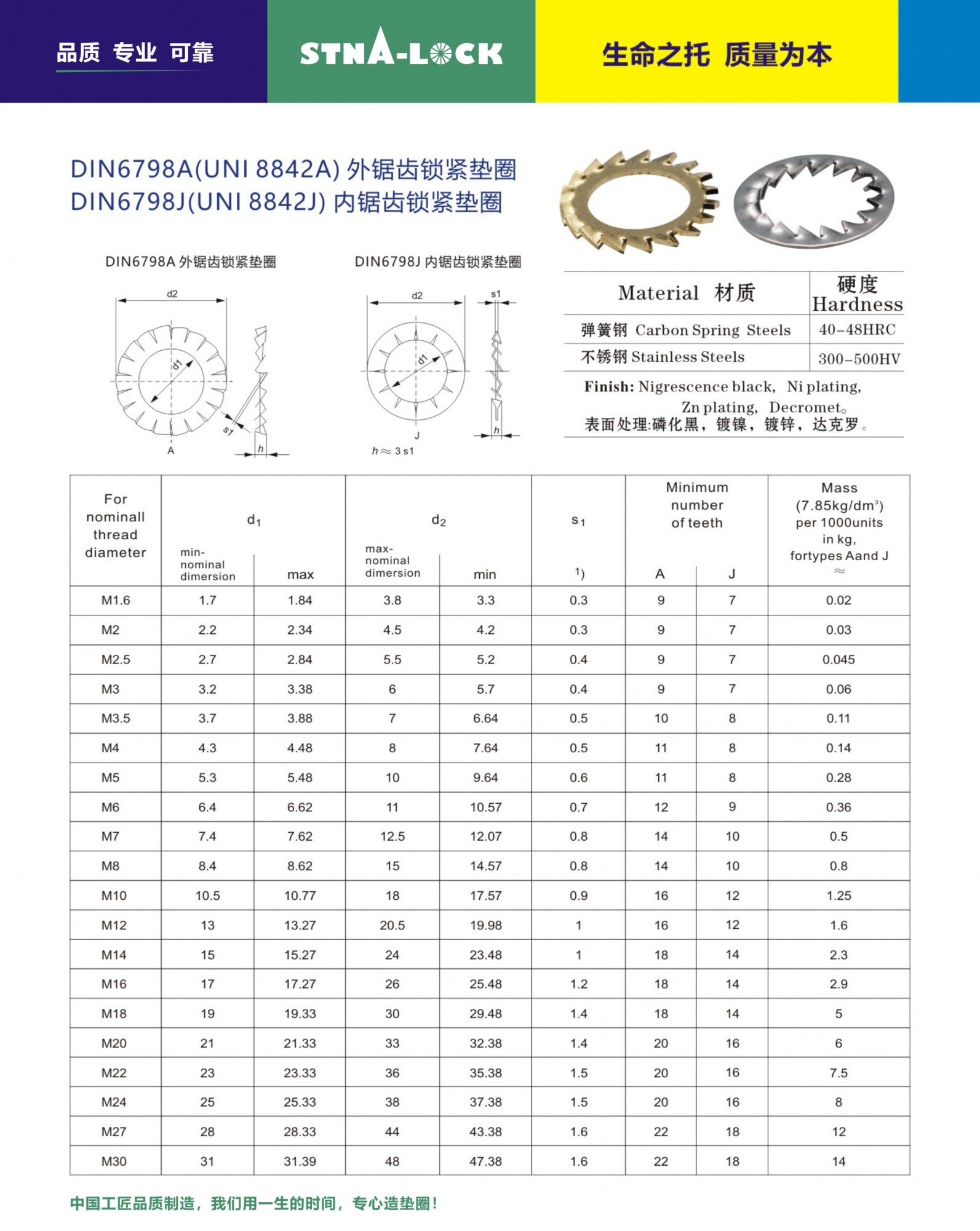 产品名称:外锯齿垫圈,外齿垫片,外锯齿锁紧垫圈,内锯齿垫圈,内锯齿垫片,内锯齿锁紧垫圈等多种叫法,STNA-LOCK是行业知名品牌锁紧垫圈制造商。