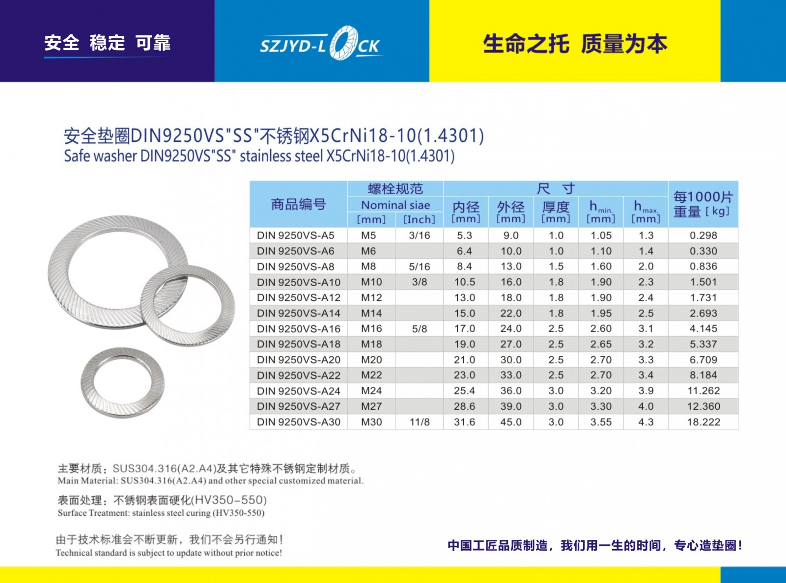 VS不锈钢防松垫圈、执行DIN9250德国标准、按螺栓的使用条件分为两类:S表示轻防松垫圈、VS表示重型安全垫圈系列、