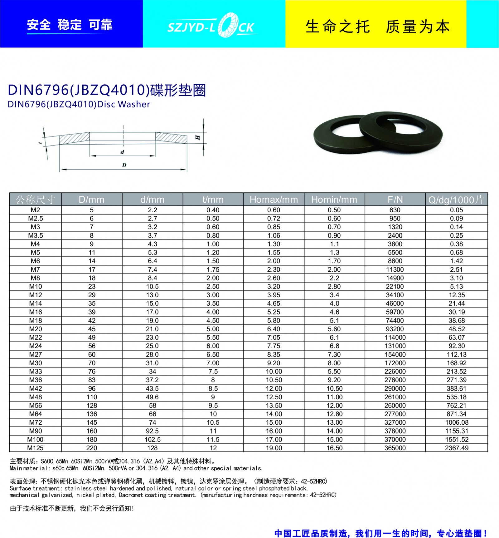 制造执行标准:符合JBZQ4010机械标准。规格:M2-M125型号,也可提供订制服务主要材质有S60C,60Si2mn,51crav4及特殊合金材质,盐浴硬化,表面处理为磷化黑,机械锌,达克罗涂层等!不提供化学电镀处理!多数情况下标准型碟形弹簧垫圈并不能完全满足用户要求,通过计算与适当调整来获得理想的订制功能!