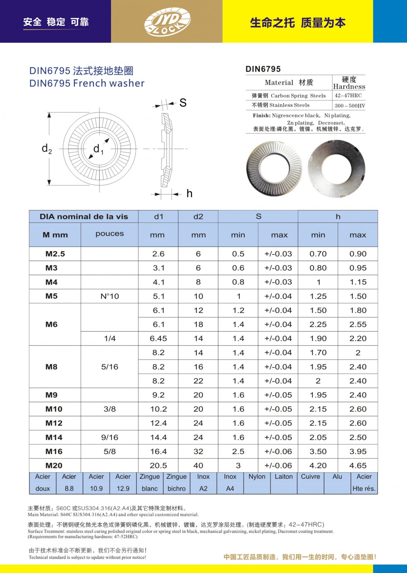 DIN6795是德国标准、法式锁紧接地垫圈是碟形垫圈改良设计、表面条纹增加了防松作用。背面设计六爪形剌破功能!主要配合螺栓螺钉拧紧时剌破金属基体表面!